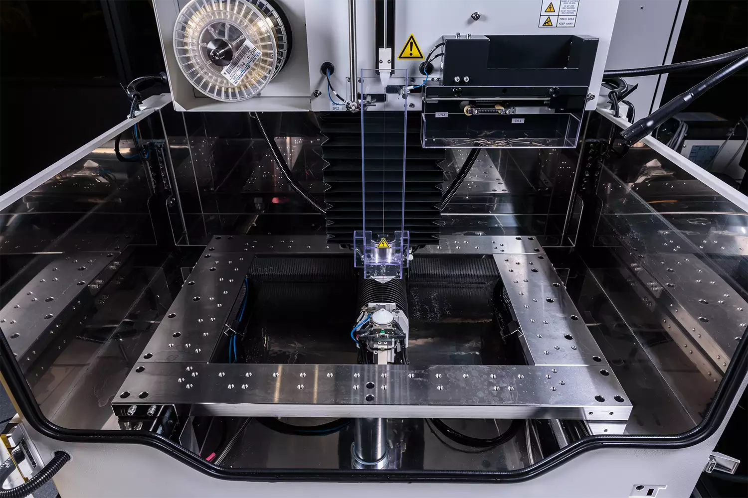 The FANUC ROBOCUT α-C600iC is a high-precision wire Electrical Discharge Machining (EDM) machine designed for reliability, user-friendliness, and advanced performance, built upon 40 years of FANUC EDM technology. Key features include its latest FANUC control with an iHMI, an improved Auto Wire Feed (AWF) system for fast and reliable rethreading, and software for remote monitoring and production management, minimizing downtime. The machine also boasts new design elements, such as a compact chassis with an integrated chiller, a durable table, and a more user-friendly taper adjustment function, making it suitable for complex parts, molds, and automated production.